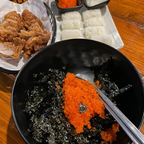 Not knowing beforehand, the set meal we ordered included Salmon Sashimi, DIY Korean Rice Ball, Crispy Fried Chicken, Soy Marinated Raw Prawns, Spicy Marinated Raw Prawns, and last but not least, DIY Rice Maki with lots of Tobiko. Boy, we were overwhelmed! It turned out to be so much food that we ended up only able to consume one round of it. Fully satisfied and very affordable at 20,900 Korean Won.